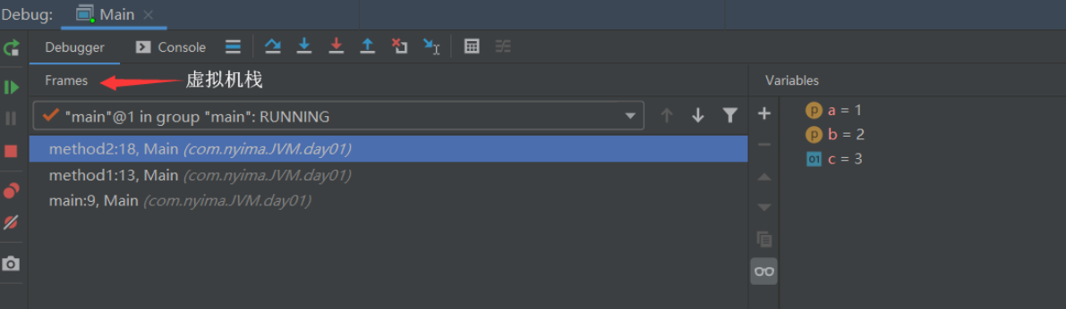 在控制台中可以看到,主类中的方法在进入虚拟机栈的时候,符合栈的特点